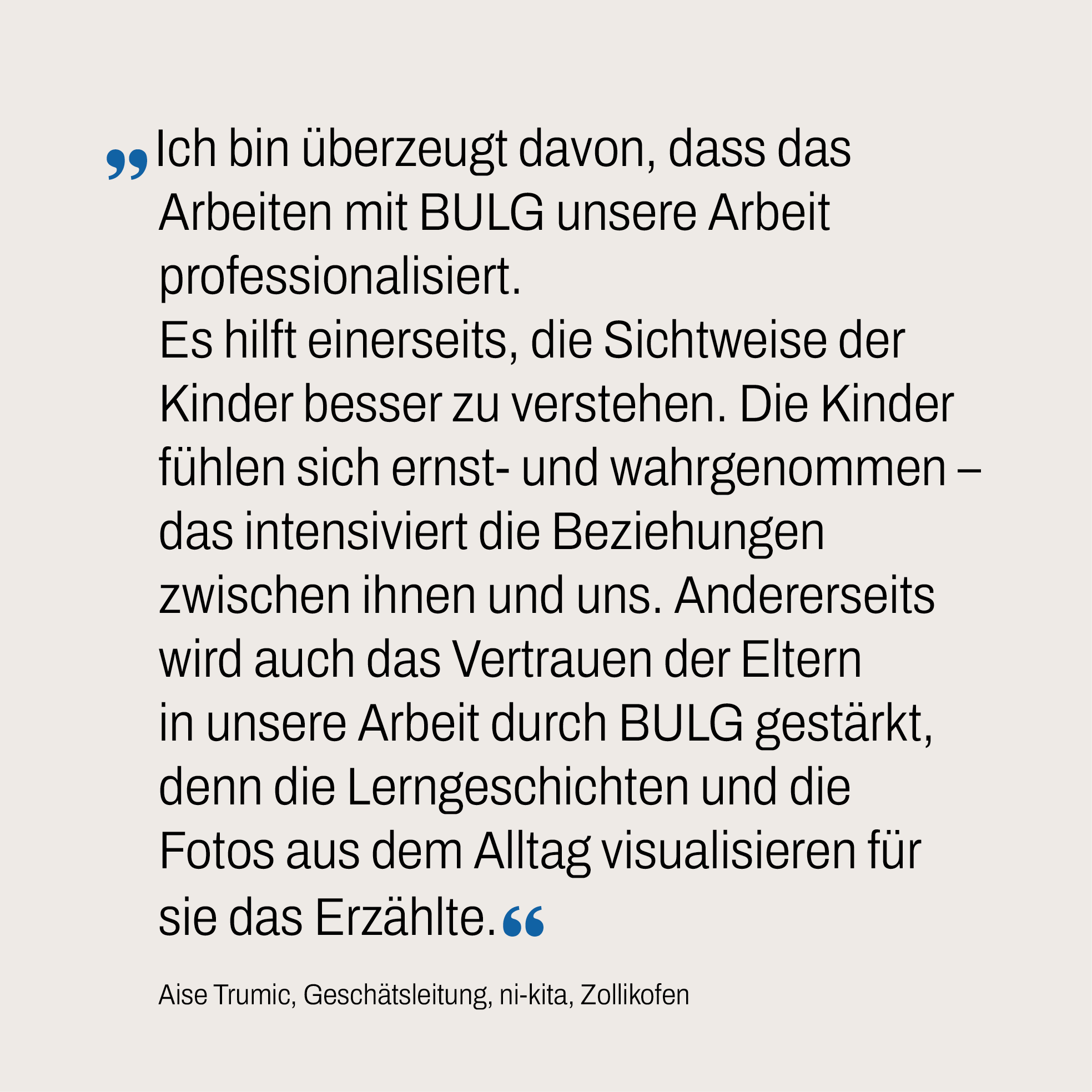 Die „BULG“ sind ein ressourcenorientiertes Beobachtungs- und Dokumentationsinstrument von kindlichen Fähigkeiten und Lernfortschritten. Regelmässiges Beobachten, Analysieren und Austauschen sind Kernelemente des Verfahrens. Ziel ist es, den aktuellen Interessen und Fähigkeiten eines Kindes auf den Grund zu gehen und daraus passende nächste Schritte zu planen, um das Kind optimal in seinen Lernprozessen zu unterstützen. Diese Lernprozesse werden in Form von Lerngeschichten und Portfolios dokumentiert. Mit den BULG können Kitas einen wichtigen Beitrag zur Umsetzung des «Orientierungsrahmens für Bildung und Betreuung von Kindern» (Alliance Enfance, 2025) leisten. Der im November 2025 neu lancierte Orientierungsrahmen trägt wesentlich zur Qualitätsentwicklung frühpädagogischer Einrichtungen bei und eignet sich für die frühe «Bildungsarbeit».